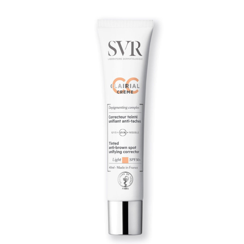 SVR Clairial CC Creme SPF 50 es una crema con acción 2 en 1: protección solar contra UVA/UVB para manchas oscuras y efecto atenuador de manchas o preventivo de su aparición. Indicada para todos los tipos de manchas de distinta tonalidad.